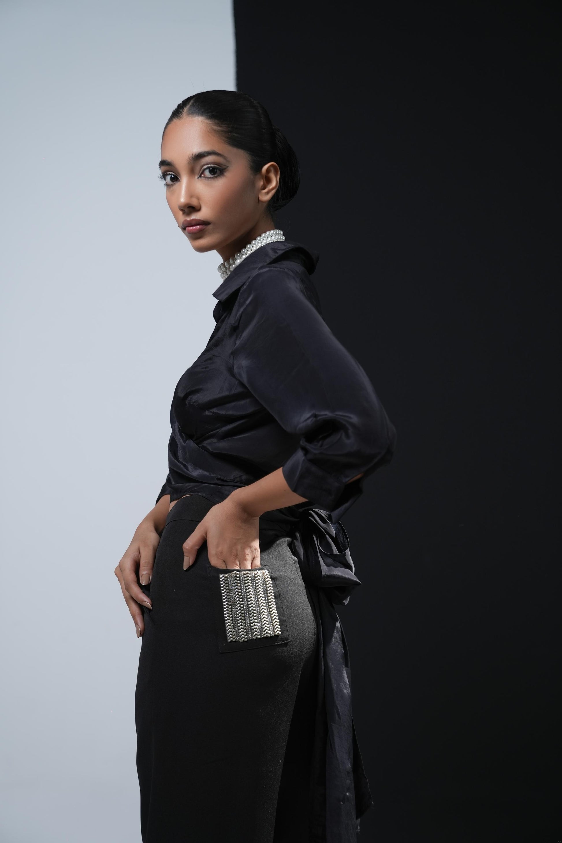 Black crepe overlapping shirt with a long bow paired with black trousers with swaroski pockets