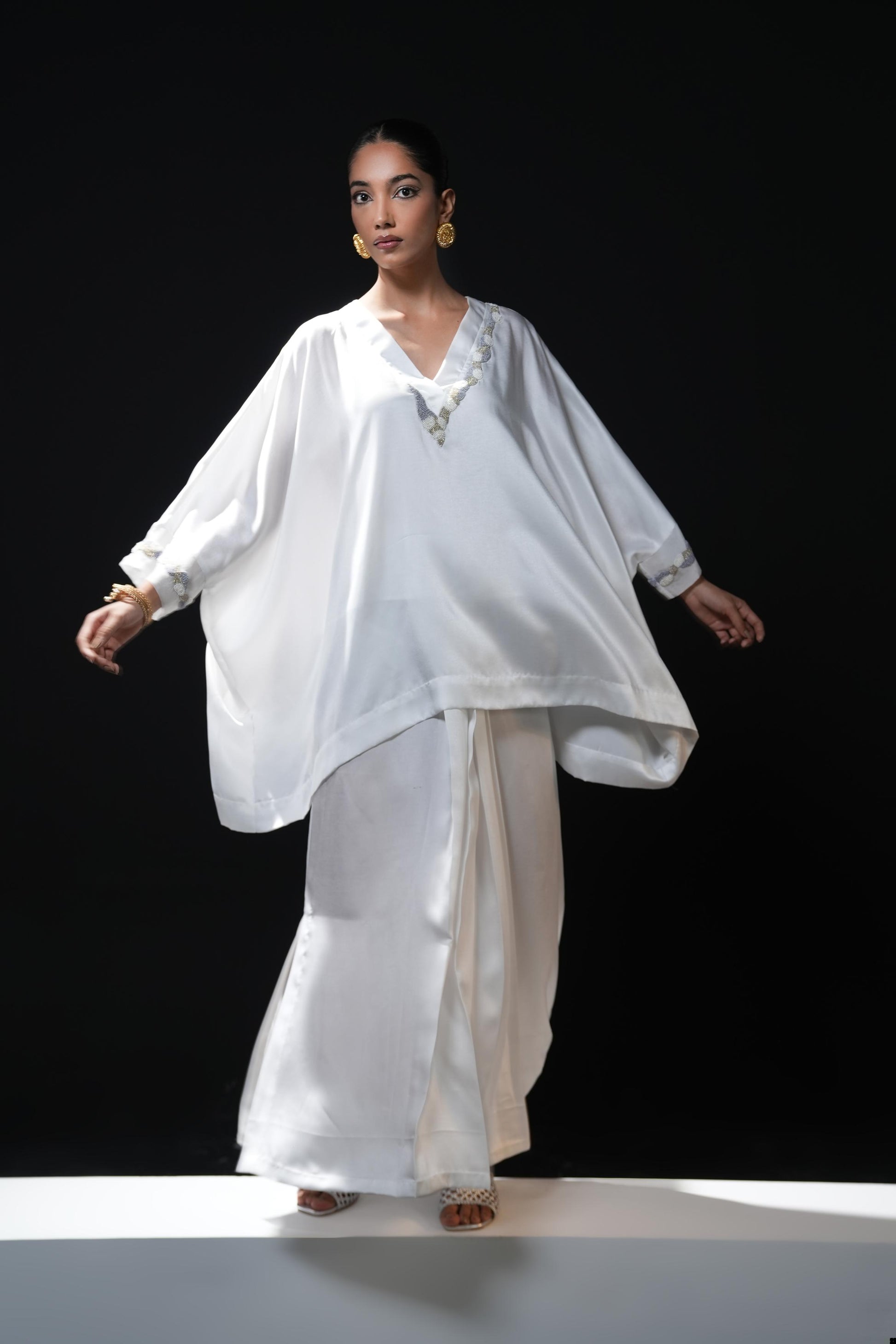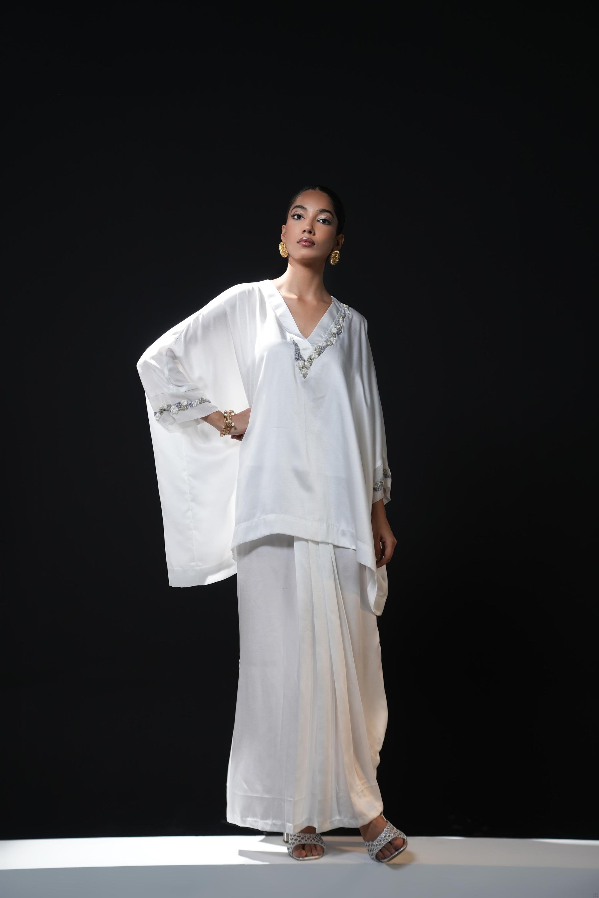 Satin dhoti with an easy flowing shirt with pearl detailing